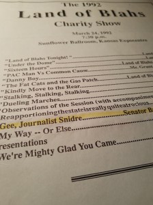 There were no greetings from my friends at the Statehouse. However, at the annual variety show staged by lobbyists and legislators, they dedicated a song to me. A lobbyist, a legislator and a lawyer sang that I have treated their efforts unkindly, and they wound up the song with a gesture and epithet I’m glad my mother wasn’t there to see and hear. (Ed. – Lyrics below)